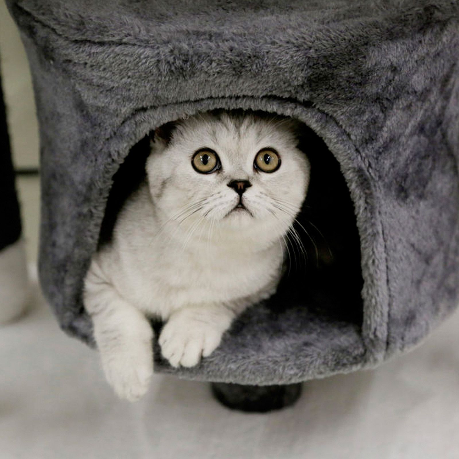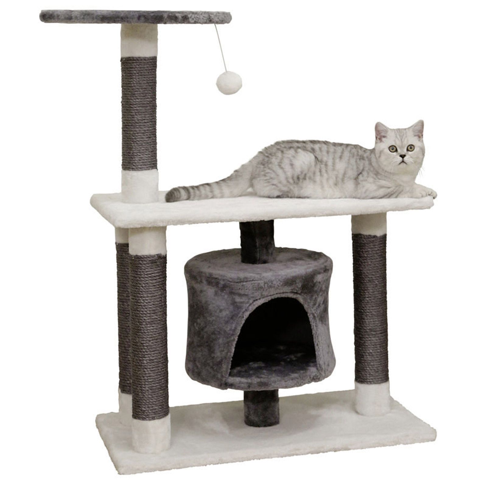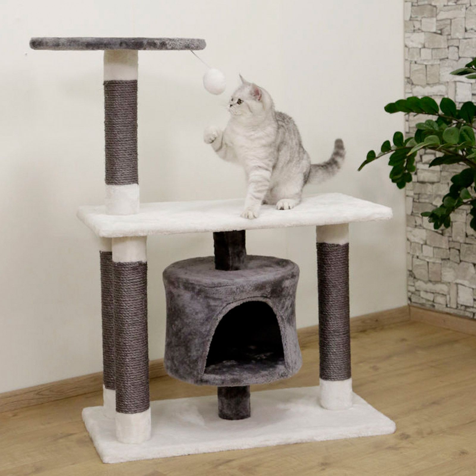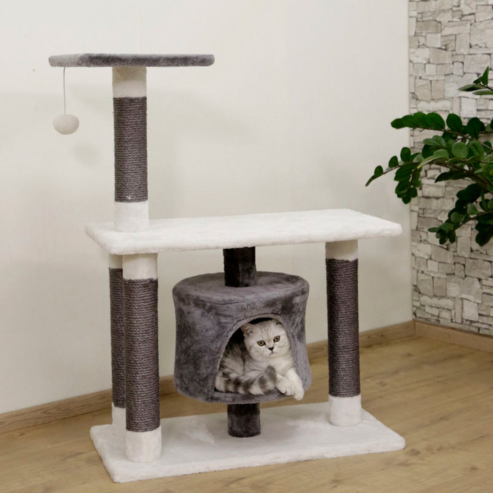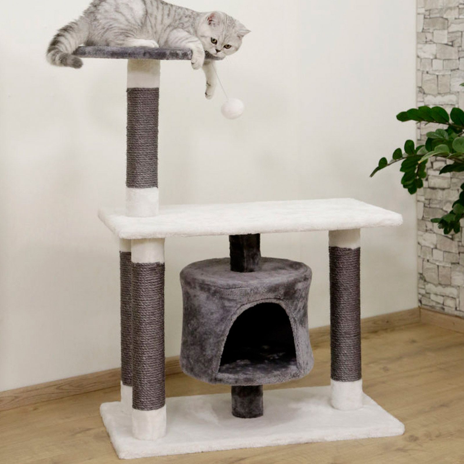 Modern és elegáns karcolóoszlop hangulatos, hangulatos barlanggal, szizál törzstel és valódi fából készült alaplappal. Ideális mászó- és játszótér minden macskának.