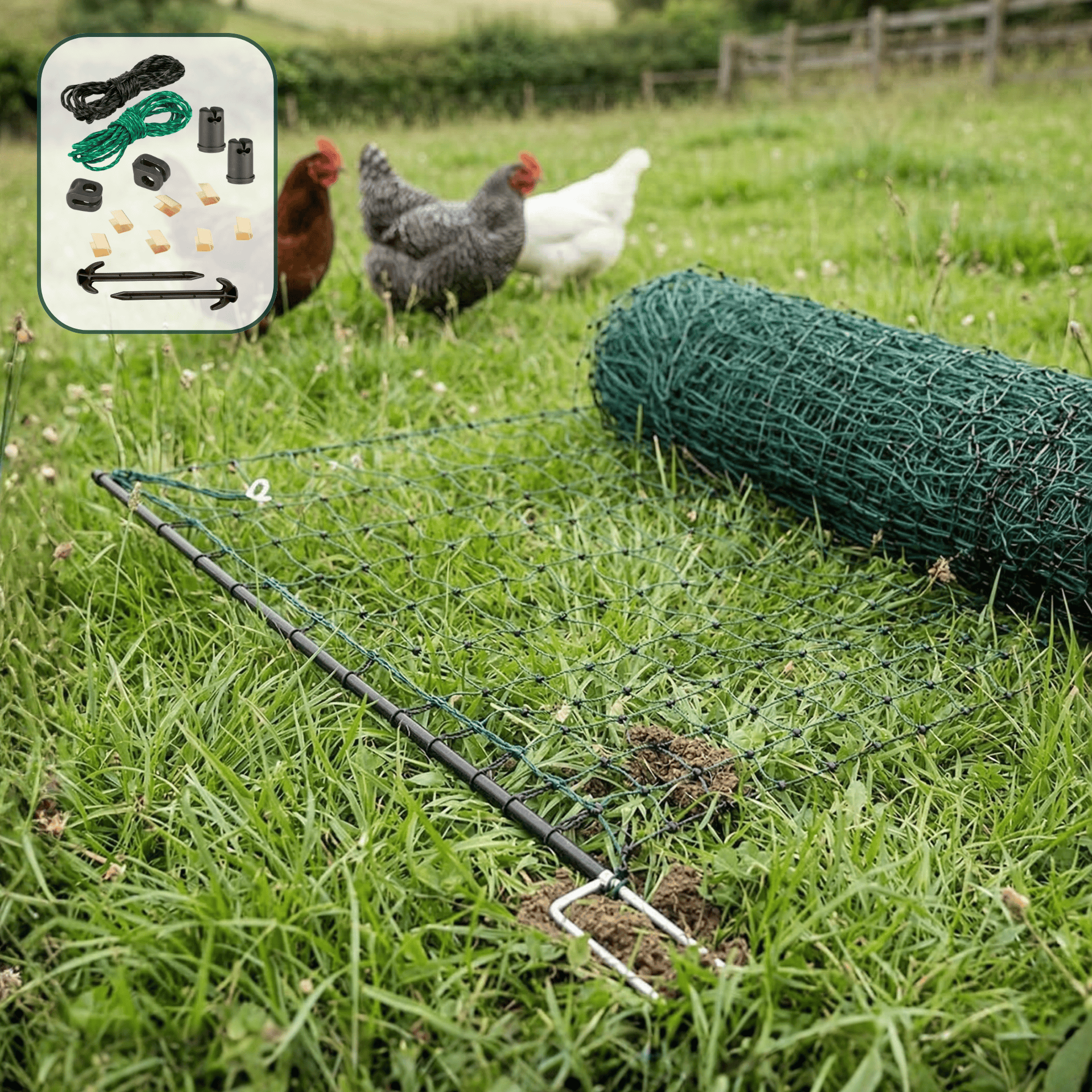 - A fejszigetelő és a talajdugó biztos tartást biztosít a baromfihálónak