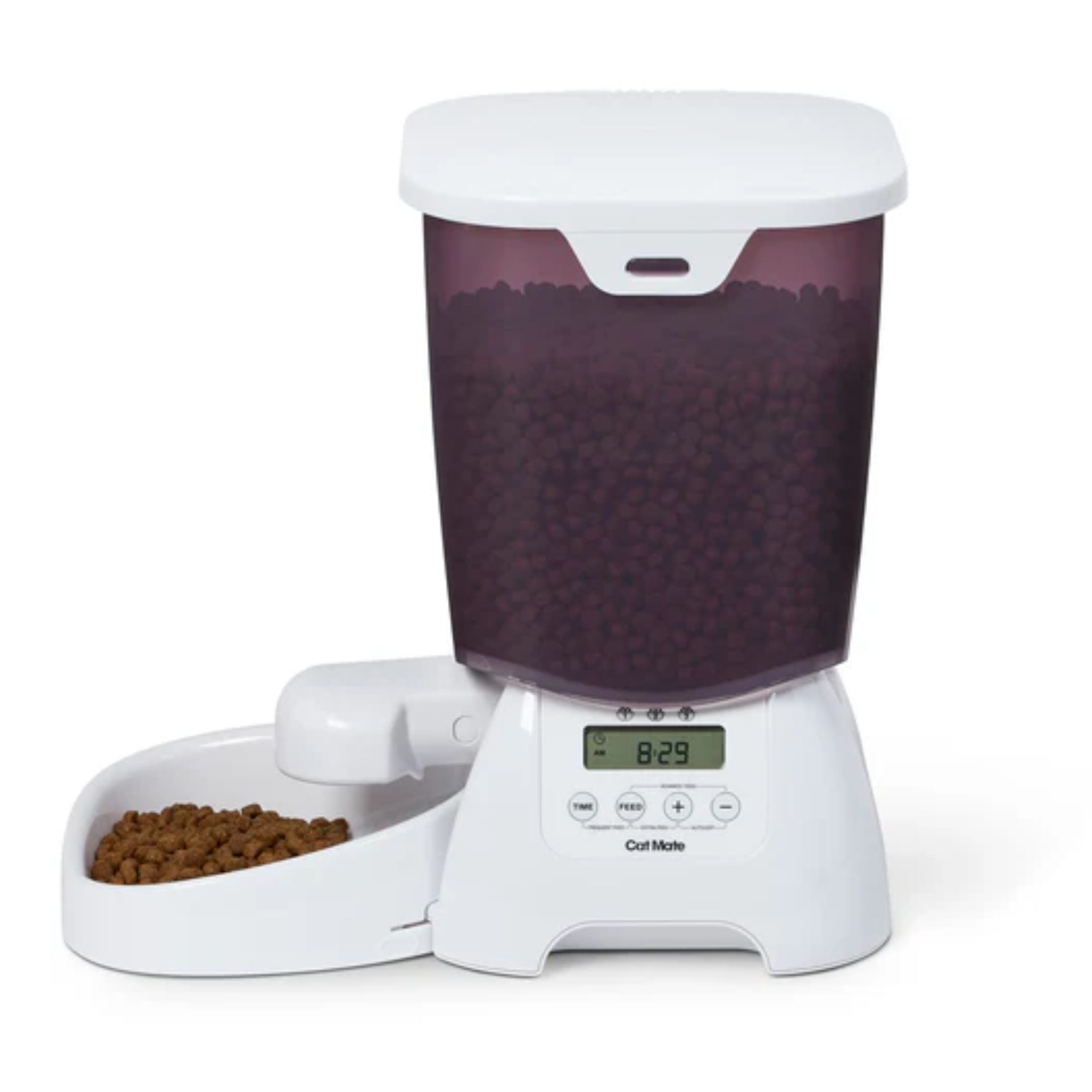 A Pet-Mate® szárazeledel-adagoló pontosan az ajánlott mennyiségű szárazeledel adagolását teszi lehetővé, hogy minimalizálja az egészségügyi kockázatokat és elkerülje a túletetés okozta magasabb költségeket . Az automata adagoló lehetővé teszi, hogy akár három egyedileg meghatározott adagméretet is beprogramozzon a nap folyamán. Igény esetén az ételadagokat a beprogramozott idő előtt is ki lehet szállítani. Alternatív megoldásként az adagolót manuálisan is lehet használni az étel pontos adagolására, ha szükséges, vagy „gyakori etetési módban” az adott étrendi követelményeknek, például a cukorbetegségnek megfelelően.