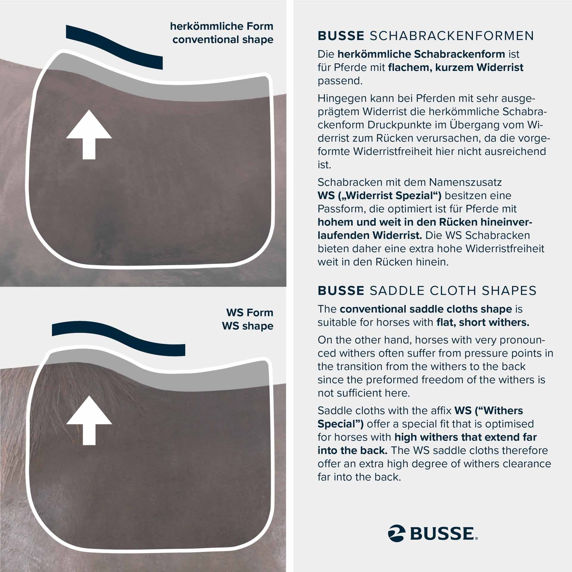 Fedezze fel a BUSSE lovas termékeit, amelyeket kifejezetten a kifinomult igényekre fejlesztettek ki. Kiváló minőségű lovaglóbakancsok optimális alátámasztással és magas szintű kényelemmel, anatómiailag formált nyergekkel a kiváló illeszkedés és nyomáselosztás érdekében, légáteresztő és vízlepergető lótakarók minden évszakhoz, valamint tartós és sokoldalú csomós kötőfék. A BUSSE-val Ön a minőséget, a kényelmet és a funkcionalitást választja, amelyek elengedhetetlenek a lovassportban.