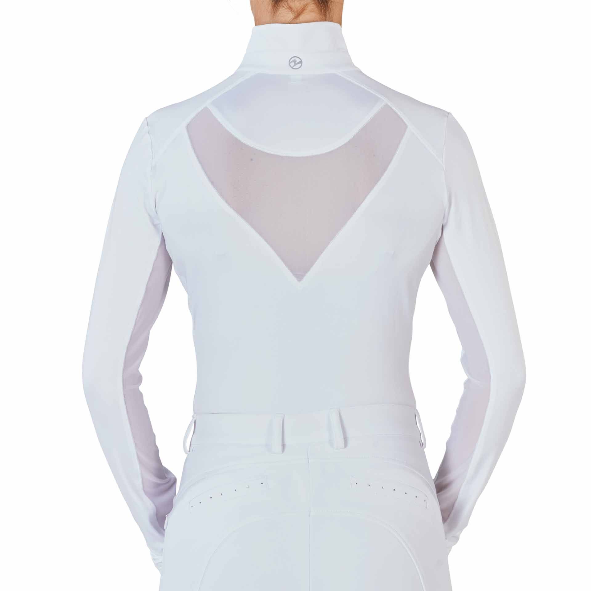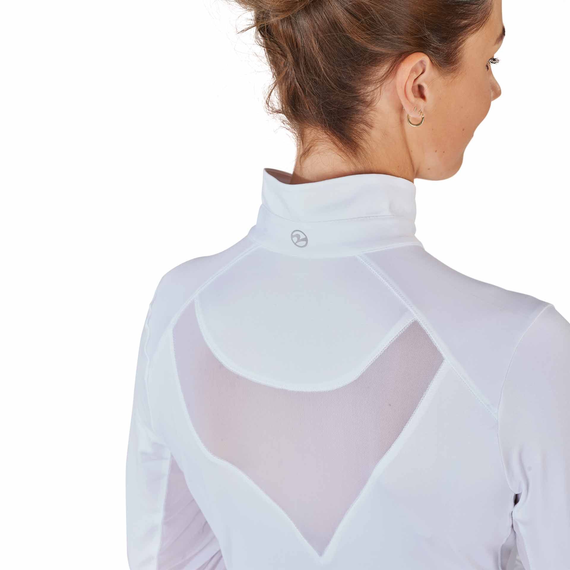 Az inget az elegánsan összegyűjtött, lekerekített állványos gallérja jellemzi, amelyet egy cipzárral elöl lehet bezárni. Különleges kiemelések a különösen lélegző hálóbetétek az ujjak mentén és a hátsó részen, amelyek biztosítják az optimális légáramlást és biztosítják a kellemes viselkedést.