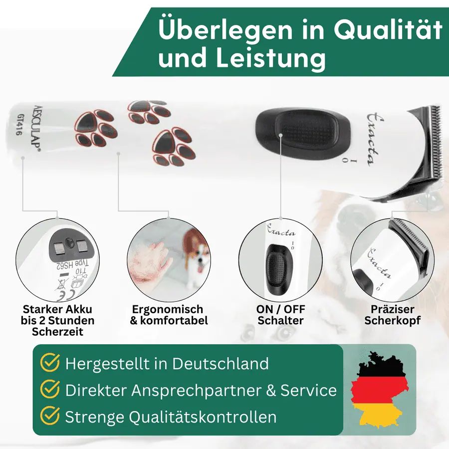 Az Aesculap Exacta egyik kiemelkedő jellemzője a kiegészítő csere vágófej, amely a szállítási terjedelem része. Ez lehetővé teszi a zökkenőmentes átmenetet a nyírás során, és folyamatos, kényelmes szőrápolást biztosít. Ezenkívül a nyírógép lenyűgöző extrém csendességével és rezgésmentességével, ami kellemes és stresszmentes élményt nyújt mind az állat, mind a gazdi számára. Mindössze 115 g súlyával és karcsú kialakításával a nyírógép jól illeszkedik a kézbe, és lehetővé teszi a fáradságmentes munkát, még hosszabb időn keresztül is. Az Exacta ráadásul egy "MADE IN GERMANY" termék, amely kiváló minőségével és megbízhatóságával tűnik ki. Kutyatulajdonosok és professzionális kozmetikusok évek óta bíznak benne.