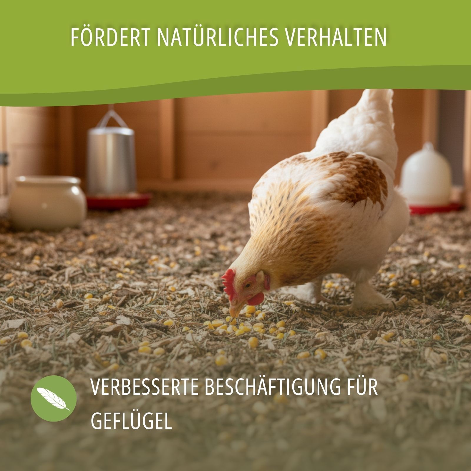 The special feature of this bedding is the integrated occupational therapy. The added corn acts as an energy snack in small quantities and animates your animals immediately. This promotes active pecking, scratching and natural foraging, preventing boredom in the coop from the start. You offer your animals species-appropriate enrichment, which ensures mental stimulation and well-being and supports instinctive behavior.
